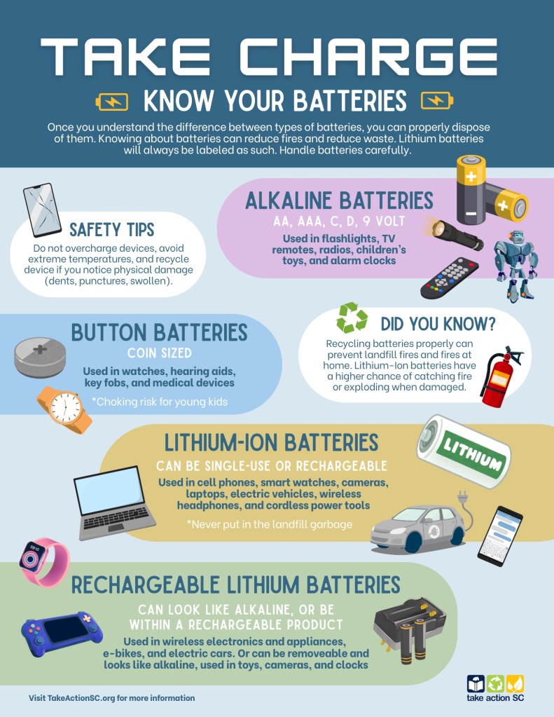Batteries are everywhere in homes, schools, businesses, and ingrained in our lifestyle. While batteries are everywhere, they can also be a hazard if stored or used improperly. Certain batteries require more unique care. Lithium batteries are a fire hazard if stored or disposed of improperly. Fires can start within your home or in the landfill if tossed in the garbage. Proper recycling can help avoid this. Learn about battery identification, recycling, and uses for batteries.